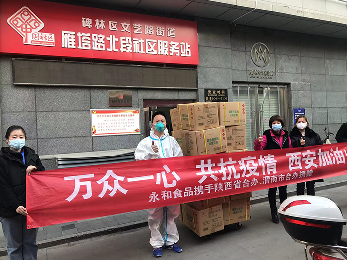 春節將至,各地疫情形勢再次嚴峻復雜,永和食品公司時(shí)刻關(guān)注著(zhù)防控形勢的發(fā)展。1月14日,永和食品公司在陜西省臺辦、渭南市臺辦支持下將498箱豆漿粉送抵西安,并在16日由陜西省婦女兒童基金會(huì )志愿者陸續全部發(fā)放到各社區,支持社區一線(xiàn)人員、困難群眾和志愿者抗擊疫情。